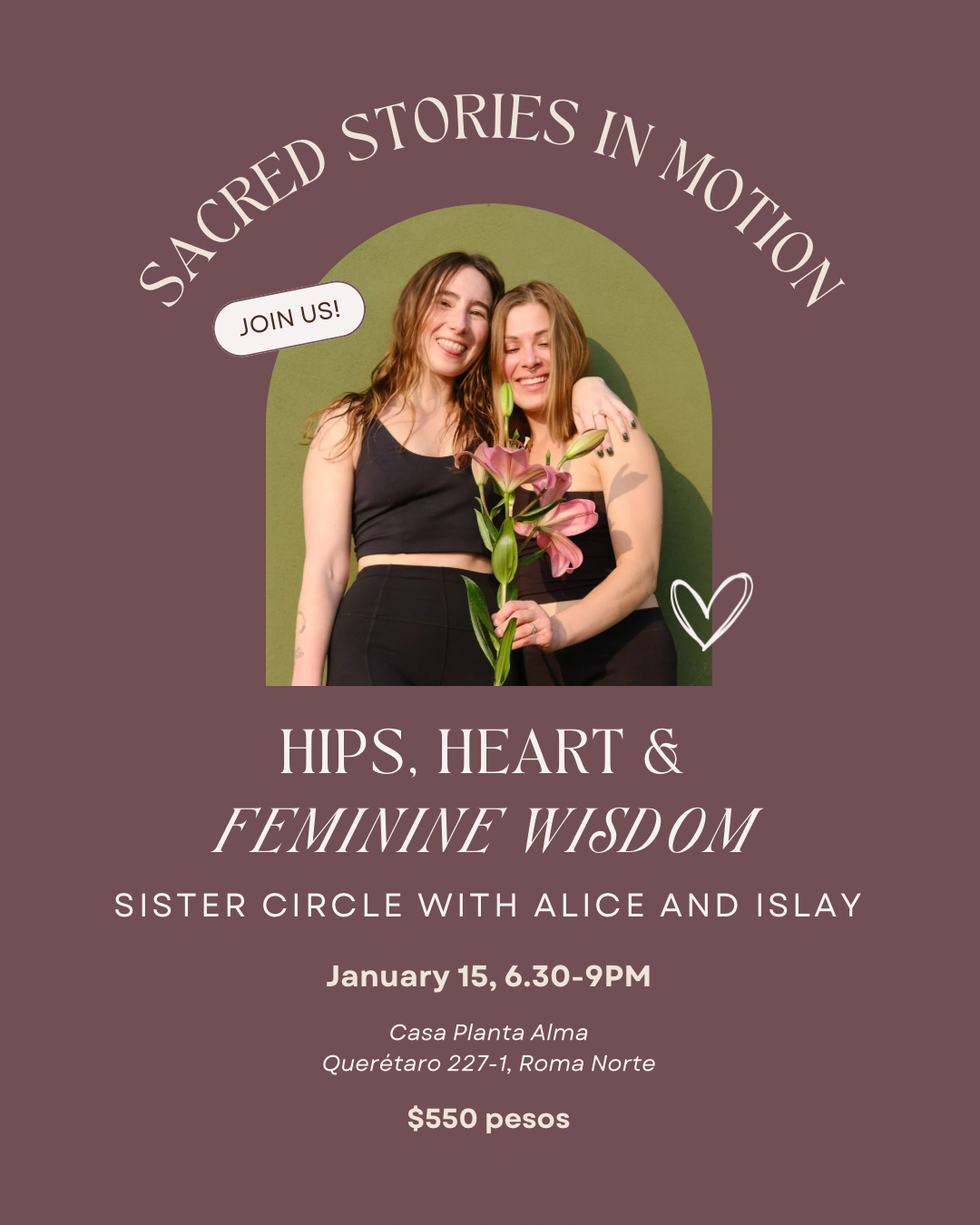 Join Alice & Islay in sacred sisterhood for a somatic journey into the hips, heart, and soul of the feminine. Through embodied movement, anatomy-based self-awareness practices, somatic dreamwork, vocal activation, and a sharing circle, we’ll explore connection, liberation, and authentic self-expression. Together, we’ll honor our truths, celebrate the feminine, and begin the year feeling grounded, empowered, and deeply supported.